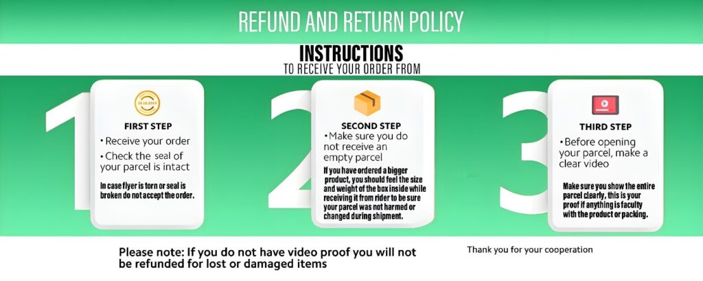 - Customers may claim refund if they receive damaged goods however, they must provide video proof of this.